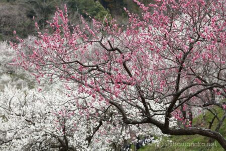 〔撮影ポイント〕一番の撮影スポットは向かいの土手の上からで、紅梅白梅の重なりを撮ることができます。撮影目的の方は歩き回らず土手の上だけで良いかもしれません。