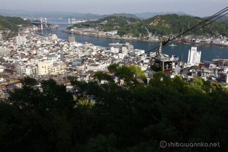 東の方面を見ると、四国へ抜けるしまなみ海道の吊り橋が見え、手前には満員の千光寺ロープウェイが上がってくる。