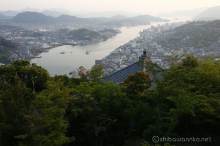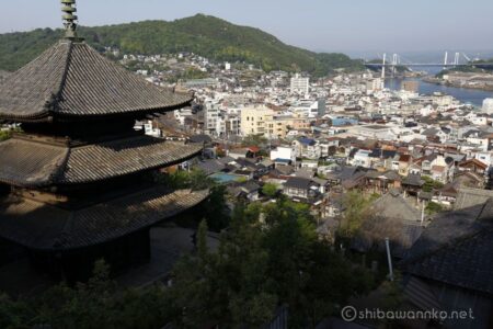 千光寺お堂の屋根越しに尾道水道と市街地が広がる。