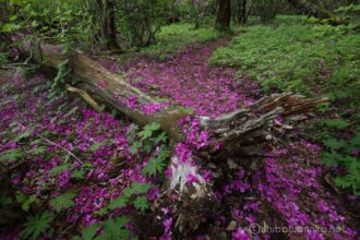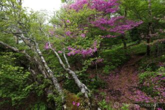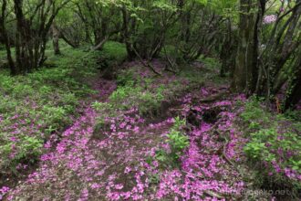 山頂に近づくにつれて、花が落ちたつつじの絨毯がぽつぽつ現れ始める。
