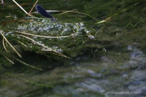 高麗川は水が綺麗なのか、黒い羽根のイトトンボが水草で羽休めをしていた。