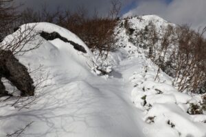 観音岳へ行くのは私一人だけのようなので、稜線の吹き溜まったルートを一人でプチラッセルしなければなりません。