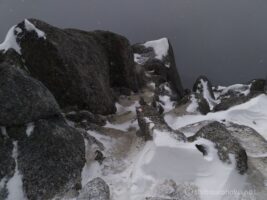 降雪も強まり、ときどきちょっとした吹雪っぽくなってきました。北岳方面は雪雲で真っ暗です。