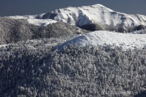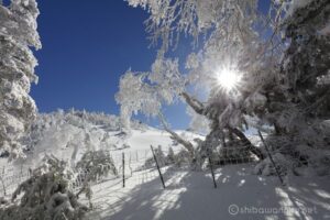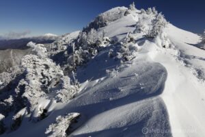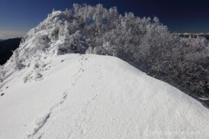 10分くらいで三伏山まで登ると空は晴れ渡り、降雪直後で手前の木々から太っとい樹氷と化し、一面白銀の世界。