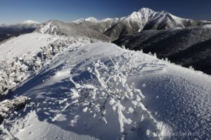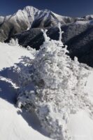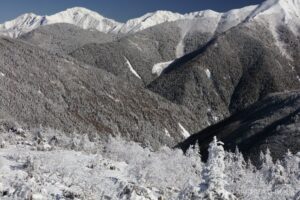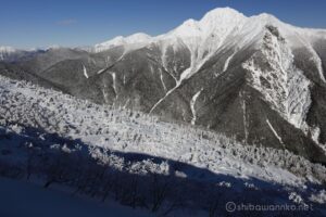 樹林帯を抜けるとすぐに開けて樹氷の木々の向こうに塩見岳が聳える。