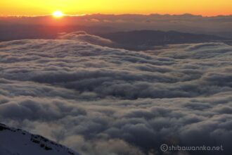 南方面は、広大に広がった雲海から頭を出した御嶽山が、真っ赤な夕日のシルエットとなって浮かび上がる。