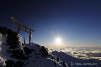いつの間にか風も収まった静寂な乗鞍岳火口で、大きさを変えつつ光り輝いている様は、雪の山頂景色と相まって眩しいほど神秘的な光景でした。