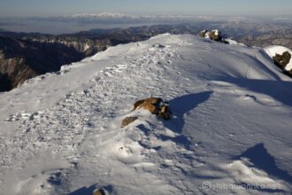 山頂直下のやや急な岩場も全部スノーシューで登り切り。
