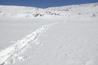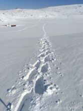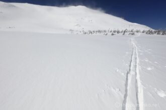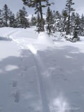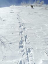 深雪全線ラッセルかと思いきや、先行するバックカントリーツアーのトレースあり。