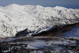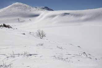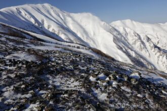 先ほどよりさらに風が強まるが何とか撮って反対の雪倉岳にポイントを探す。