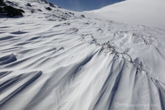 そのシュカブラを覆い隠すように足元に雪煙が川のように流れる。
