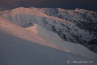 手前のピンクに焼けた斜面と雪倉岳のシルエットが美しい。