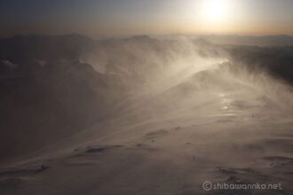 しかし、ただの朝焼けの写真ではなく雪煙が舞うところが冬山っぽくていいかも。