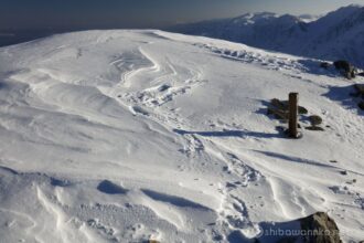 歩き始めると三角形にカットされた面白いシュカブラと白馬三山が綺麗。