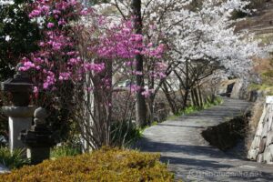 山門をくぐると桜とツツジの向こうに石段と楽屋堂が続きます。