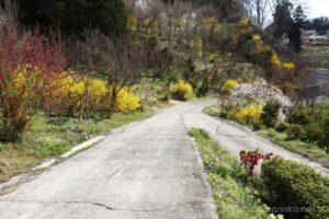走っていると突然道端脇の斜面に黄色いレンギョウが見え始める。