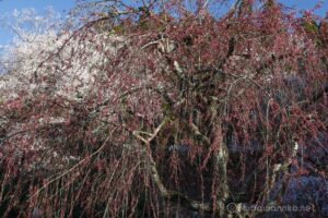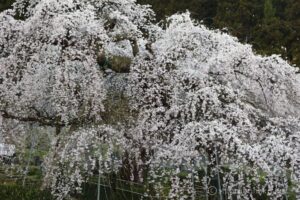 枝垂れ桜は満開なんですが、太陽が山の端に隠れてしまい枝垂れ桜には日が当たっていない。