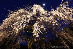 同じように桜に月を入れて撮ってみますが、若干トワイライトタイムが終わって暗くなりすぎたかな。