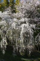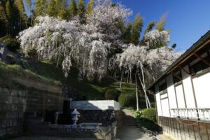 御堂を半周して墓地を通って裏側へ行くと、奥の竹林の中に大きな満開な枝垂れ桜が現れる。