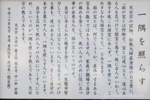 「一隅を照らす」というお題で、「自分を忘れて他の人々のためにつくす人になれ、というのが一隅を照らす教えであり、天台宗の教えであります。」と書かれている。