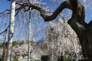 境内に入ると既に日は傾く中、満開の枝垂れ桜が迎えてくれます。