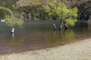 北竜湖畔を散策すると、水没した木が数本あり新芽を吹いている。