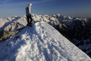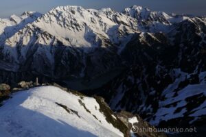 安堵するも、針ノ木岳の山頂自体が両側が切れ落ちたようなナイフリッジのようになっており、なかなか落ち着かない。