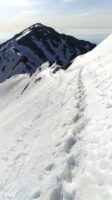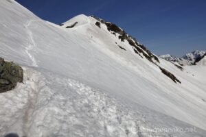 前日までのトレースが硬く締まりステップ状になっており、雪渓はだんだん急になるもののアイゼンも不要なくらい。