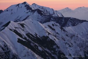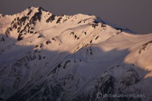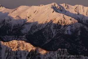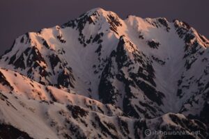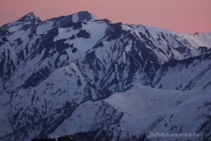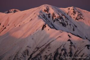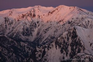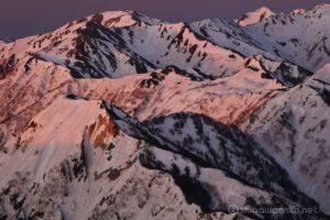 夜明けとともに北アルプス全山がモルゲンロートに染まる。