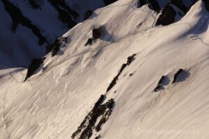 下りていくと、ほぼすべての沢筋から膨大な量のデブリが雪渓を塞いでいる。