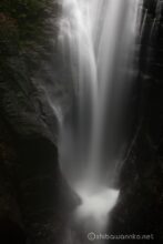 下部まで下りると、トイ状の岩盤が滝壺に向けて細まっていく特徴的な姿を見ることができる。