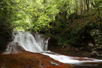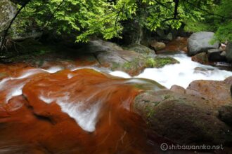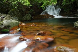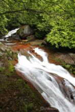 この滝は滝壺はないですが、独特の赤い渓床を広く流れていくため、滝下の渓流と一緒に撮ると良いでしょう。
