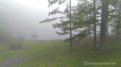 霧でどこが池かも分からないくらい真っ白い。案内の看板があったので、かろうじて真正面に御射鹿池があることは分かりますが。