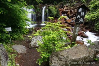 広くなだらかな渓流瀑と渓流にかかる新緑を合わせると美しい。