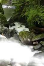 早く流れている雲が太陽を隠すタイミングを待って渓流の流れを撮る。