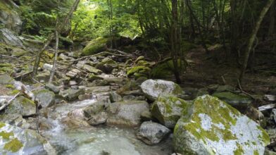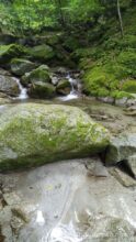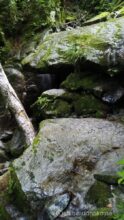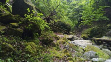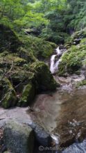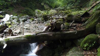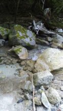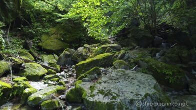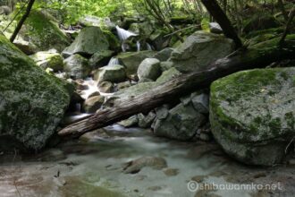 水量が少なく渓流の深さも浅いので、通常の登山靴でもどこでも徒渉が可能ですが、全体として苔むしていて滑りやすい。
