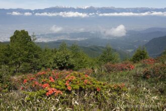 満開のレンゲツツジの向こうに王ヶ頭の鉄塔群を見る、美ヶ原を代表する景観です。