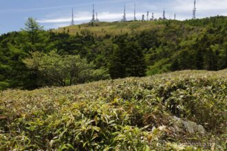 武石峰からのレンゲツツジ咲く高原奥に見る、王ヶ頭鉄塔群の景色が最高。