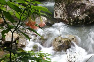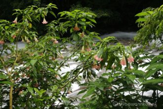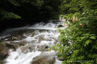 渓流脇には、下向きに咲く大きなピンク色の花が咲いています。