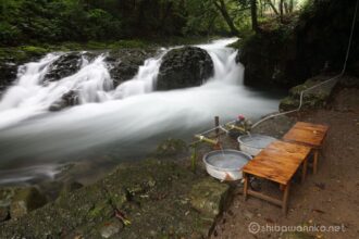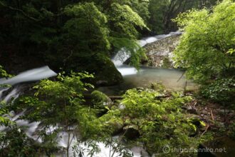 少し進むと、本谷川と荻ノ入川が合流する、幅2m高さ2mの出合滝が現れます。