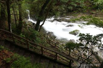 階段を下って川に下りて行くと、増水して真っ白になった本谷川が見えてきます。