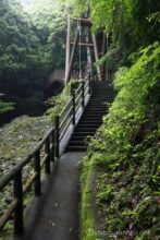初景滝までは緩やかな遊歩道でしたが、ここから上は急な階段や吊橋も現れ、渓谷道の様相を呈してきます。