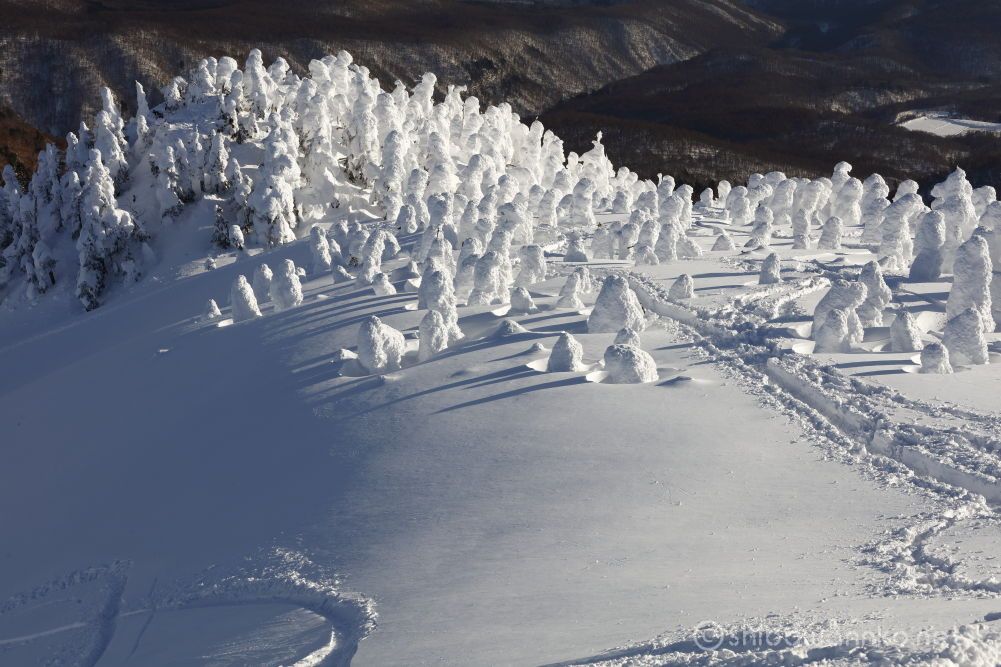 西大巓手前のスノモン密集地帯を見下ろして。 あそこを通ってきた。