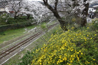 さらに歩いて山北鉄道公園に着かづくと、今度はヤマブキの黄色い花が桜並木の根元を覆ている。