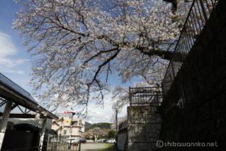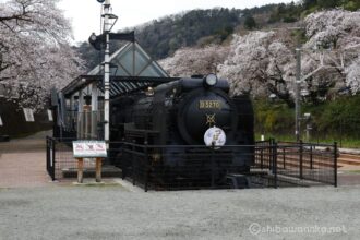 SLの横から空を仰ぎ見ると、満開の桜が覆い被さるよう。ちょうど青空がのぞいて綺麗綺麗。