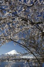河口湖半からは桜の越しに降雪直後の真っ白な富士。