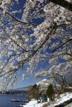 河口湖の真ん中あたりまで回り込むと、そろそろ桜並木も終わり。