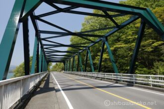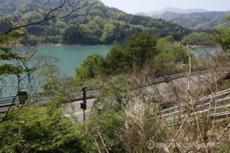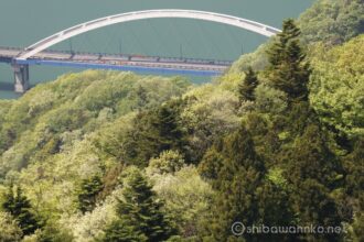 眩しいくらいの新緑の向こうに宮ケ瀬湖とアーチ橋。