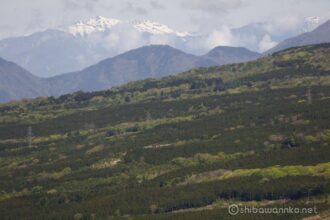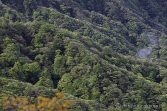 ふと見下ろすと山腹の埋め尽くすカラフルな新緑が美しい。