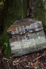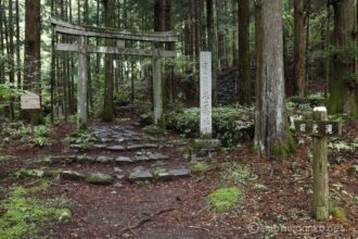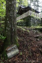 森に入るとすぐに若子神社。濡れた石階段を上ると、脇から沢に下りる道が続く。